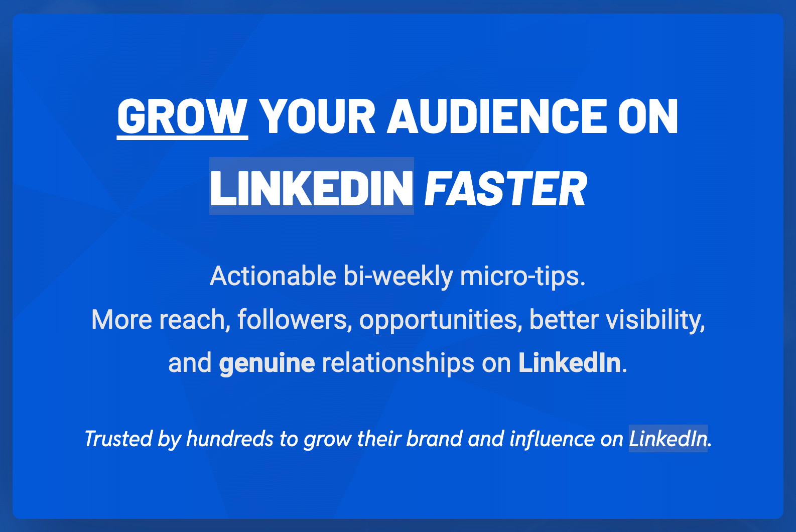 Grow your audience Faster. Actionable bi-weekly micro-tips. More reach, followers, opportunities, better visibility.